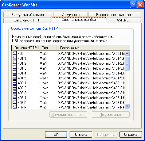 Вкладка Custom Errors (Специальные ошибки) позволяет определить страницу сообщения об ошибке, которая будет отображаться в случае возникновения определенных ошибок HTTP (рис. 18.14).